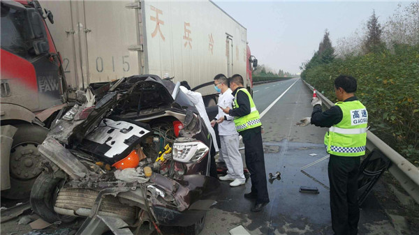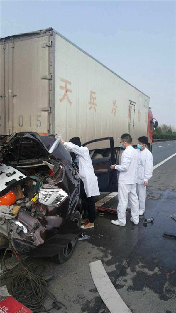 原来,10月27日上午,急救医生叶天明和护士杨旺到潜江广华医院接一位慢阻肺的病人到同济医院接受治疗。下午2点半左右,车辆行至汉宜高速仙桃段开始堵车,急救车沿着应急车道行驶时,发现高速上发生了一起追尾交通事故,一辆油罐车在行驶时跟车过近,采取制动不及,先后撞上前面三辆小型客车和一辆厢式货车。事故造成五辆车不同程序受损,其中最严重的一辆江苏籍比亚迪轿车,受到油罐车的撞击后,惯性向前运动,车头撞上前方厢式货车尾部,比亚迪轿车车头车尾皆受力挤压严重变形,旁边漏了满地的油,很多人都不敢靠近。