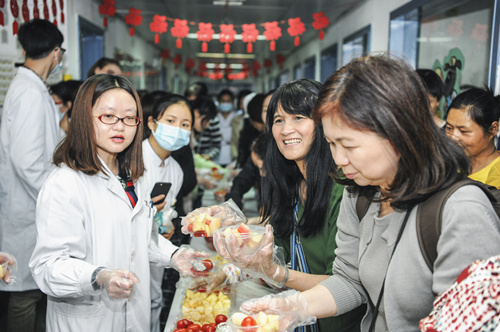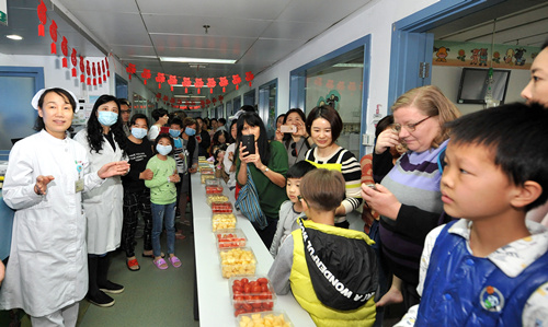 红色的小番茄、绿色的小黄瓜、黄色的小香蕉,4月4日上午9时,同济医院儿科肾脏病专科病房里,一群黄头发、蓝眼睛的外国妈妈、外国小朋友正和中国小患儿一起做水果沙拉。